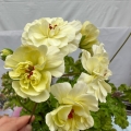 Цветы очень крупные, густомахровые, кремово-желтые. Края лепестков резные.