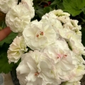 Пеларгония зонартикового типа, куст крепкий, цветок очень махровый, оттенка топленого молока. Особенность сорта – окраска цветка, при роспуске серединка у него зеленоватая, а по мере роспуска эта зелень становится не белой, как обычно у белых сортов, а кремовой или даже желтоватой, что очень необычно.