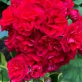 Зонартиковый гибрид, горизонтальный тип роста. Очень крупные, сильно махровые ало-красные цветы, со светлой изнанкой. соцветия пышные, плотные. Красивый куст.
