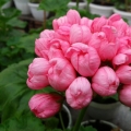 Зональная тюльпановидная пеларгония. Цветочки в форме тюльпана бело - розового цвета. Иногда проявляются белые или яркие сектора, штрихи, точки. Кончики лепестков зубчатые. Кустик небольшой, очень охотно цветет.