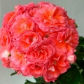 Поражающая обилием цветков, объединенных в крупные роскошные соцветия, напоминающие полураспустившиеся розы. Махровые персиково-розовые цветы собраны в крупные шапки, лепестки складчатые. Куст стандартный, ветвится легко, компактный.