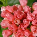 Сорт относят к розоцветным. Формирует очень аккуратный кустик с крапчатыми соцветиями. Цветет обильно, розочки в соцветии раскрытые. Сорт без недостатков!