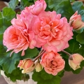 Ириол Eternite. Зональная пеларгония. Компактный тип роста. Цветоносы прямостоячие, соцветия махровые, плотные, крупные. Цветы имеют несколько оттенков с переходами цвета в бело-розово-лососевый.