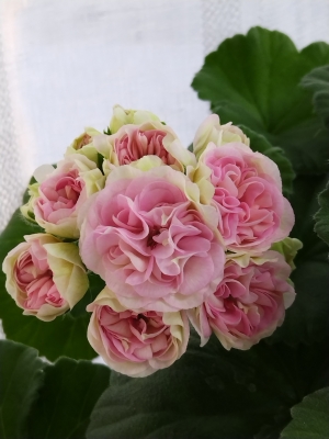 Роскошный крупный махровый и очень нарядный. Куст стандартный, хорошо формируется, соцветия и цветы крупные, густомахровые, розовые, цвет к середине цветка гуще, края светлые, в межсезонье даже зеленоватые. Листья ярко-зеленые, без зоны, сорт неприхотливый, укореняется легко.