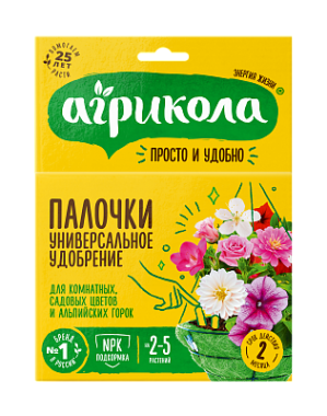 Агрикола-палочки универсальное цветочное — комплексное, бесхлорное, высокоэффективное удобрение длительного действия. Удобрение содержит сбалансированное количество макро- и микроэлементов, предназначено для подкормки и защиты от насекомых-вредителей комнатных и садовых цветов, альпийских горок.