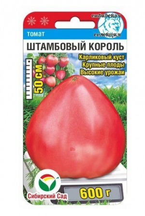 Карликовый куст, Крупные плоды, Высокие урожаи. Среднеспелый крупноплодный штамбовый сорт селекции АФ «Сибирский сад» для открытого грунта, 100% приспособленный к условиям Сибири. При высоте растения не более 60см с одного куста можно подучить до ведра крупных вкусных сибирских томатов. Куст мощный штамбовый, высотой 55-60см с частым заложением кистей. Плоды крупные , сердцевидные, насыщенно малиновой окраски, массой 200-550г. Мякоть мясистая, сахаристая на изломе с небольшим количеством семян.