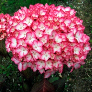 Красивая гортензия, которая используется для декоративного озеленения. Она отличается низким ростом и компактным пушистым кустом с широкими зубчатыми листьями. Высота куста составляет 80-90 см. Листья темно-зеленые, в молодом возрасте они имеют темно-красную окраску.
