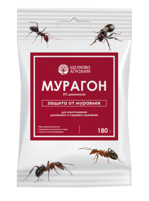 «Мурагон» – инсектицид контактно-кишечного действия против синантропных муравьев: рыжих домовых, черных садовых и других видов. Эта готовая к применению приманка в виде гранул подходит для дома и сада. Попав в почву, средство за несколько недель распадается на соединения, безвредные для почвы и окружающей среды.