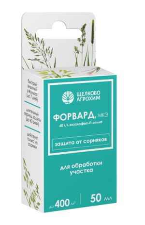 Препарат «Форвард, МКЭ» – послевсходовый системный гербицид для защиты культур от однолетних и многолетних злаковых сорняков в течение всего вегетационного периода. Хизалофоп-п-этил – действующее вещество препарата «Форвард, МКЭ» в форме масляного концентрата эмульсии – проникает в растения через листья и быстро поглощается ими, вследствие чего сорняки останавливают свой рост и погибают. К тому же гербицид эффективен для борьбы с вторичным ростом корневищ многолетних растений. Хизалофоп-П-этил применяют против однолетних (овсюг, просо куриное, щетинники) и многолетних (пырей ползучий, свинорой) злаковых сорняков. «Форвард, МКЭ» – препарат из серии ЭкоПлюс с повышенной биологической эффективностью. Также оказывает сниженную пестицидную нагрузку на культуры.