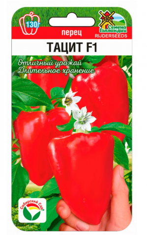 Растение полураскидистое, высотой до 80 см. в открытом грунте. Перцы конусовидной формы, ровные, глянцевые, яркие, выглядят очень привлекательно. В технической спелости светло нефритового и золотистого цвета, а в биологической приобретают насыщенный ярко-красный цвет. Длина плода до 15 см, стенка толстая — 6–9 мм. Вкус сочный, ароматный и сладкий. Тацит F1 демонстрирует отличное качество плодов, хорошую транспортабельность и подходит для длительного хранения. Не теряет своих качеств и сохраняет привлекательный внешний вид до 35 дней! Хорош и в свежем виде, и во всех видах кулинарных блюд и домашних заготовок. Этот Гибрид обеспечивает урожайность в открытом грунте до 5 кг с 1 м², сочетая высокую продуктивность с отличным качеством.