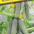 Очень скороспелый (42-45 дней от всходов до плодоношения) партенокарпический гибрид женского типа цветения, с букетным расположением завязей. Предназначен для выращивания в открытом и защищенном грунте. Зеленец длиной 10-12 см, массой 90-110 г, частобугорчатый, белошипый, без горечи, с плотной мякотью, хорошо транспортируется. В пазухе листа образуется по 5-8 завязей. Плоды темно-зеленой окраски со светлыми полосами до 1/3 плода. Использование универсальное (салатное, для засолки, маринования). Отличается ранним обильным урожаем. Гибрид устойчив к настоящей и ложной мучнистой росам и корневым гнилям. Урожайность одного растения 5,5-7,0 кг. Холодостойкий, устойчив к перепадам температур. Посев на рассаду — в конце апреля. Высадка рассады в грунт — в конце мая – начале июня в фазе 3-4-х настоящих листьев. Посев непосредственно в грунт – в середине мая. Схема посадки: 50х50 см.