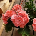 Зональная карликовая пеларгония. Кустик требует небольшой формировки. Шапочки очень красивого цвета, нежнейшие, лососево-оранжевые.